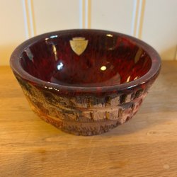 Du budar på en Skål med en karakteristisk rödaktig, glaserad insida och en mörkare, ojämn yta på utsidan, samt har tre små fötter och ett handtag, se själv för bedömning.