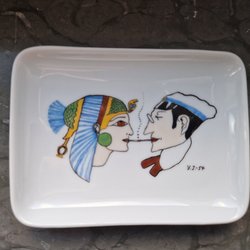 Vacker, dekorativ keramik vas med blå glasyr och detaljer i relief. Finns ett antal stämplar och vad som förefaller vara en signatur BN vilka syns i botten, se bild 4.