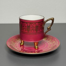 Vackert vintage kaffeset i porslin från anrika Königlich privilegierte Porzellanmanufaktur Tettau, grundades 1794 i Bayern. Servisen består av kopp, fat och assiett i en utsökt mörkröd dekor med gyllene blomster- och fågelmotiv. Insidan av koppen och mitten av tallriken pryds av romantiska blomstermotiv i klara färger.