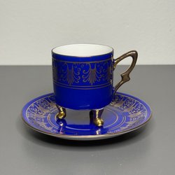 Porslinet har en lyxig känsla med förgyllda detaljer och vågade kanter – en tidlös klassiker för samlaren eller för dig som älskar att duka med stil. Märkt i botten med “Königl. pr. Tettau” och lejonvapen.