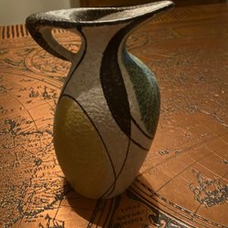 En dekorativ keramikvas med ett distinkt mönster och en varm färgpalett. Denna vas är perfekt för att lägga till en touch av vintage charm till ditt hem.