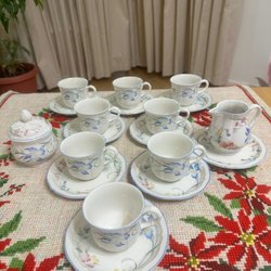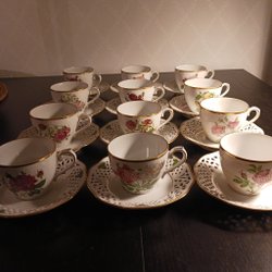 Kaffeservis från Bavaria Tirschenreuth, Germany. Står även ”Dek. Hackefors”. Kanna plus 7 stycken koppar. Kannan har en höjd på 21,5 cm. Kopparna har en diameter upptill på ca 7 cm och en höjd på ca 6,5 cm.