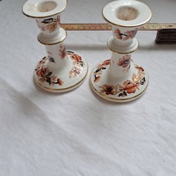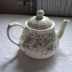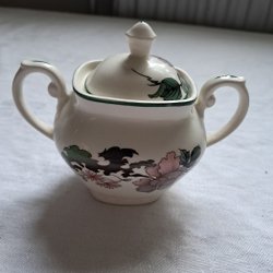 Blå och vit med blommönster och guldkant.
