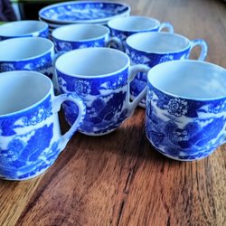 6 Fina mockakoppar med tillhörande fat. 1 kopp och ett fat har små nagg,
