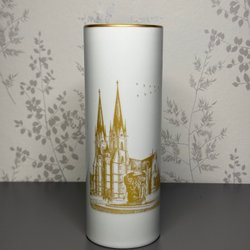 En underbar liten skål i klassisk Capodimonte-stil, med reliefmotiv av spelande putti och mjukt blåvit glasyr med handmålad gulddetalj. Formen är böljande, som en blomkalk på fot, och fångar ljuset på ett sätt som gör den till ett litet konstverk i sig.