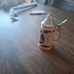 En tysk ölsejdel med blå bakgrund och motiv av hus, människor och växter.