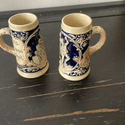 Två handgjorda krus i keramik, randig struktur i blågrå toner, tags också i keramik 13 cm höga i perfekt skick betalning swish till tradera