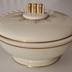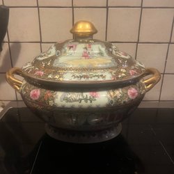 En vacker terrin med lock. Med blommor och fjärilar och guldfärgade detaljer. Har cirka 21 cm i diameter och är cirka, 22,5 cm med lock på. Utan locka cirka 15 cm. Hämtas på Södermalm i Stockholm eller skickas till dig. Du bestämmer. Maila mig vid frågor. Betala helst inom tre dagar efter avslutad auktion. Med vänlig hälsning, Fanny.