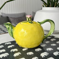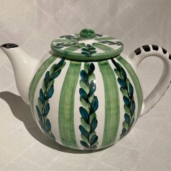 En vintage tekanna med dekorativa detaljer. Observera att det finns en skada på insidan av tekannan.