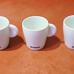 Tre koppar med olika mönster. En kopp är märkt "Eschenbach, Made in Western Germany" och en annan är märkt "Eastern, People's Republic of China".