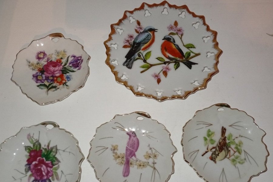 Olika väggtallrikar med motiv av blommor och fåglar.