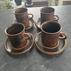4 st fina kaffekoppar, koppen 6,2 cm hög och 7,5 cm i diameter fatet 13,6 cm. Det finns några små prickar i två koppar, skav på kanten på en och ett nagg på ett fat, se dom tre sista bilderna.