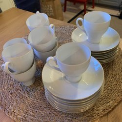 En kopp är lite naggad, se sista bilden. Annars fint men använt skick!