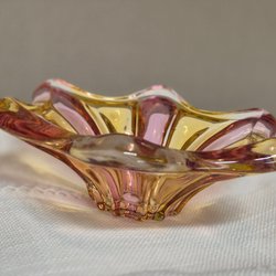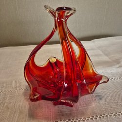 Vas från Schramberg. Höjd 21cm, diameter öppning 3,8 cm och bottendiameter 6 cm. Svart, vit och rödmönstrad. Ett nagg i ytterringen på undersidan och några små olämnheter i glasyren från tillvärkningen. Se bilder.