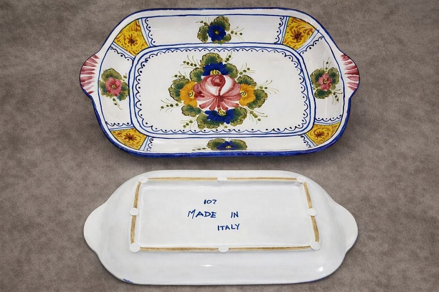 Fad med blomstermotiver. Fadet er mærket "Made in Italy".