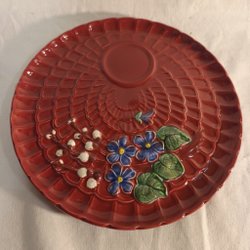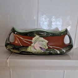 En keramikskål med dekorativa blommor. Skålen har en unik form och är prydd med detaljerade blomapplikationer. Den har en krackelerad glasyr som ger den en vintagekänsla. Några av blommorna är lite trasiga, det kan man se på bilderna. Höjd 15cm, bred 15cm