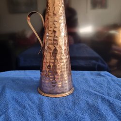 En dekorativ vas med ett intrikat mönster i olika färger. Vasen har en unik design med utskurna detaljer vid halsen.