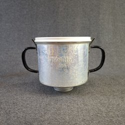 En röd keramik kanna, ca 15 cm hög och ca 16 cm bred.