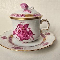 En söt liten kopp med tillhörande fat. Koppen är dekorerad med en fågel. På fatet är guldkanten lite sliten.