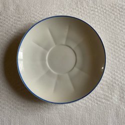 En blåvit litet porslinsfat med vackert mönster. En liten nagg på kanten knappt synlig.