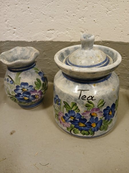 En keramikburk med lock och en vas med blommönster. Burken har texten "Tea" skrivet på sig.