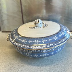 Terrin med lock och dekorativa detaljer.