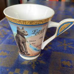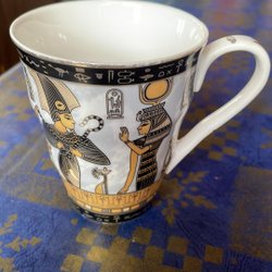 Mugg med blå bakgrund och guldfärgade egyptiska motiv. Handtaget är vitt.