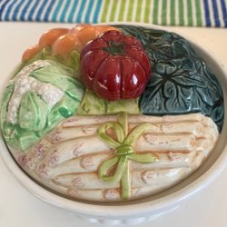 Keramisk rivskål med mönster av oliver och röda blommor. Skålen är grön och vit.ca 10 cm i diameter
