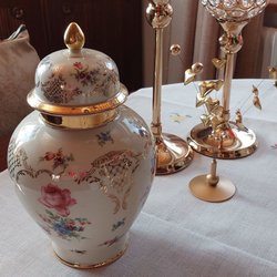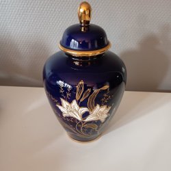 En vas med lock i vitt porslin med blå blommönster och gulddetaljer. Vasen har en räfflad form och en guldfärgad knopp på locket.