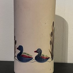 Keramikbägare från North Eagle. Bägaren har en rödbrun glasyr med inslag av mörkare toner. Den är tillverkad i keramik och har en fot som ger den stabilitet.