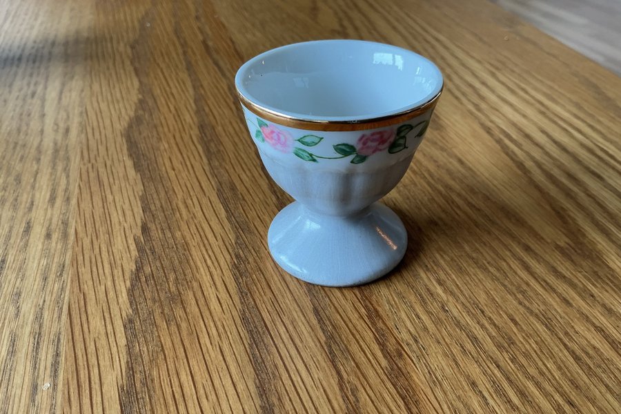 Äggkopp med ett charmigt rosmönster och en guldkant. Perfekt för frukostbordet.