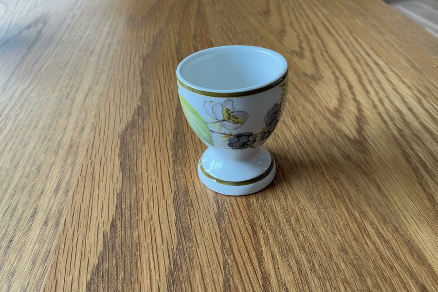 Äggkopp med ett detaljerat blommönster i olika färger. Äggkoppen har en vit bas med en guldfärgad rand runt kanten och foten.