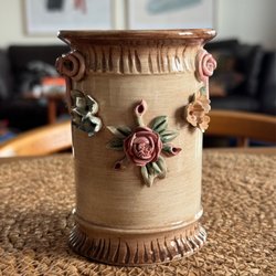 Denna stora vas är från 70-talet, har krackeleringar inuti och lagad på ert ställe syns på sista bilden. Därav priset också