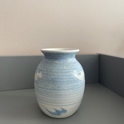 Vacker handmålad vas i glas. Vasen har ett unikt mönster i blått och vitt med abstrakta former i rött, gult, svart och blått. Höjden är 12 cm och diametern är 13 cm.