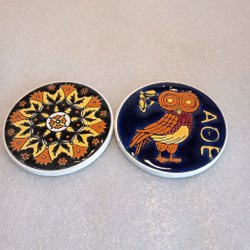 Två kaffekoppar med texten "Import" undertill. Kopparna har ett blommigt mönster i rött, rosa, blått och grönt med guldfärgade detaljer. Handtagen är också guldfärgade.