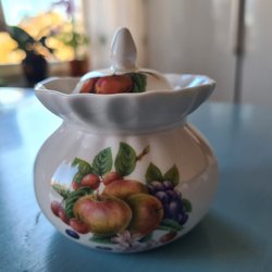 Dansk signerad vas i keramik med ett mönster av blad och bär i vitt och gult.