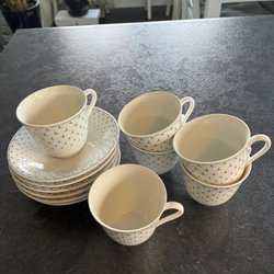 4 st fina kaffekoppar, koppen 6,2 cm hög och 7,5 cm i diameter fatet 13,6 cm. Det finns några små prickar i två koppar, skav på kanten på en och ett nagg på ett fat, se dom tre sista bilderna.