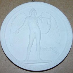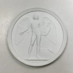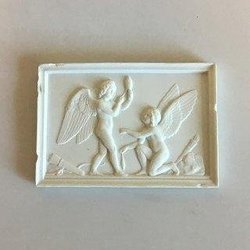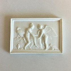 Royal Copenhagen Bisquit "Nytårets Genius" Platte. Kopi af Davis Jensen af relief modelleret på Nysø 1840. Måler 13,8 cm. Afslag på kant og klinket