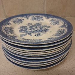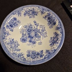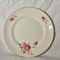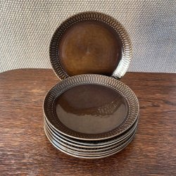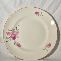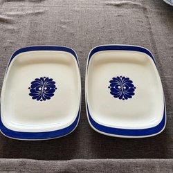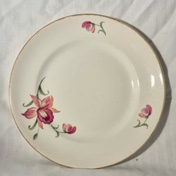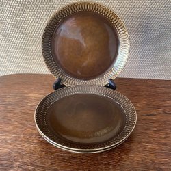 Middagstallrik, 25 cm, vitt med ett mönster i gult, svart och grått längs kanten. Inga nagg eller sprickor