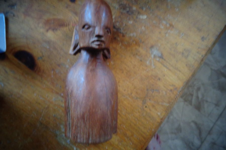 En handgjord träskulptur föreställande en stiliserad figur. Perfekt som en unik inredningsdetalj. ca 12cm