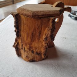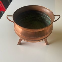 Kastrull i koppar med lock. Diameter ca 23cm, höjd ca 16cm. Locket är märkt PJN, kan dock inte garantera att det är originalet till kitteln. Bucklig och lite missfärgad.