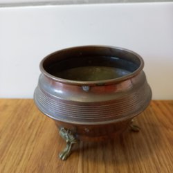 3 st kopparskål med tre fötter. 13cm hög på 2st den lilla 11cm hög 17 dm på dem 2 stora den lilla 14 diameter