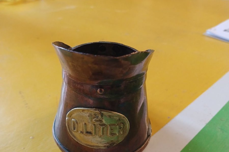 En söt liten kopparkanna märkt 2 dl. Inga stämplar. Varken under eller på sidorna