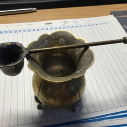 En dekorativ kopparvagn, perfekt som prydnad. Den har en unik design med detaljerade hjul och en kopparbehållare. Passar utmärkt som en inredningsdetalj i hemmet.