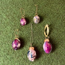 Tavlorna fästa på en träplatta, går att hänga upp på väggen med tavelöglan på baksidan.
