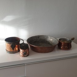Set med kopparkärl. Inkluderar en kanna, en skål och två mindre kärl.