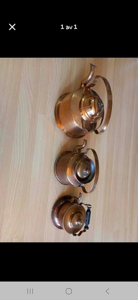 Tre kopparkannor i olika storlekar. Perfekta för inredning eller samling.