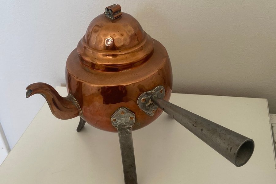 Kopparkanna med lock och tre ben.