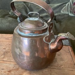 Kopparkittel med handtag och lock. Kittelen har en pip med ett litet lock som kan öppnas och stängas.