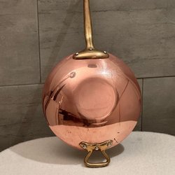 Kopparkastrull från Bourgeat, tillverkad i Frankrike. Kastrullen har en diameter på 18 cm och kommer med ett matchande lock. Insidan är i rostfritt stål och utsidan i koppar. Professionell köksutrustning